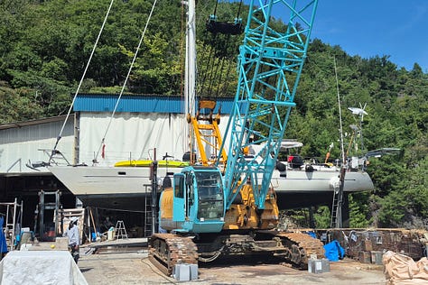 So now the boat is tied up in Kurahashi for the winter. Mast out and a big job list for the yard. Will see how this goes???