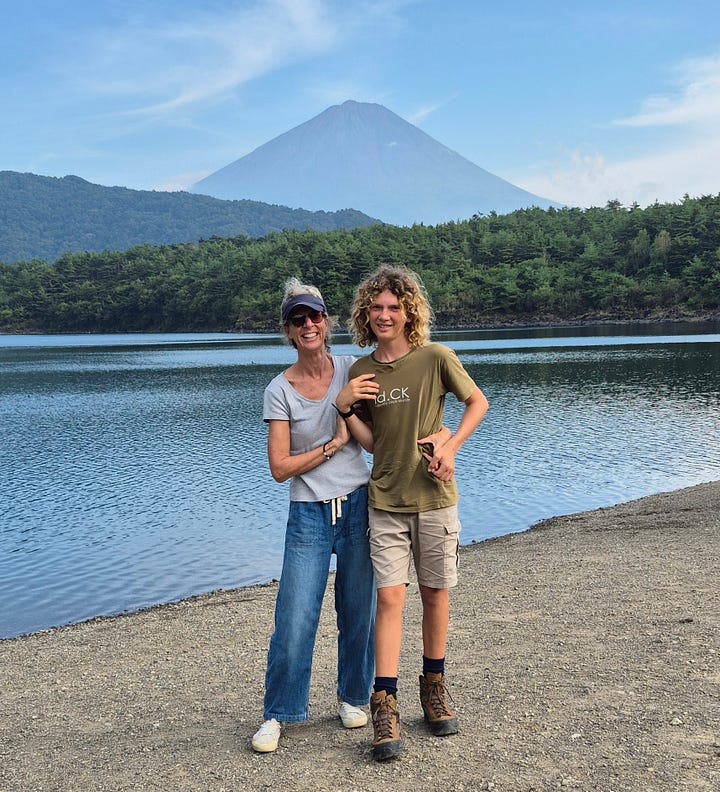 As Morg and I were flying out of Tokyo returning home for Morgans exams we took the opportunity to spend a few days at Mt Fuji where Warren had hired a beautiful lodge in the forest. We weren't intending to climb Mt Fuji but decided to give it a go even though we didn't have any hiking gear with us . We ended up hiring some wet weather gear and set off at 5am for the hike to the top. We chose to climb the Fujinomiya trail which starts at 2380m ending at 3776m. It’s a relatively steep climb over jagged basalt which sounds like broken glass when stepped on and about half way you could feel the lack of oxygen. Morgan struggled a little until he got used to it- Giovanni has lungs the size of Africa due to his free diving and l didn't really notice any shortness of breath but more a slowing down of pace. Nobody was hurtling up the track that's for sure and a lot of the Japanese were sucking on disposable oxygen canisters. Not sure that this altitude warranted these and thought they may have been a bit of a gimmick but who knows.