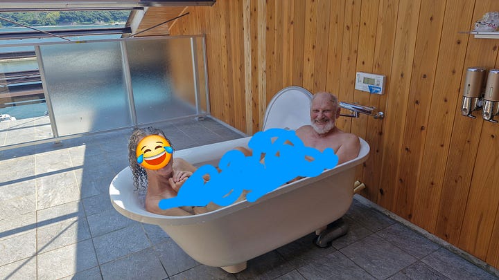 Next minute we’re butt naked in the bath and the owner comes back in and starts taking photos of us from all sorts of angles while we’re both trying to cover up each others bits. Not even any bubbles to hide in. I was just laughing so much at this weird situation and she was probably really happy to get some shots of people who were really enjoying her bath. Don’t want to think what forum she posted these on, most likely the Japanese B&B that she uses. No shame.
